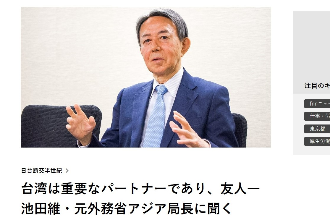 日本台灣交流協會台北事務所前代表(大使)池田維日前接受Nippon.com訪問表示,台灣對日本是重要夥伴及友人,為了讓台灣活動的國際空間更加廣闊,日本應該積極支持和援助台灣。(圖/翻攝自Nippon.com)