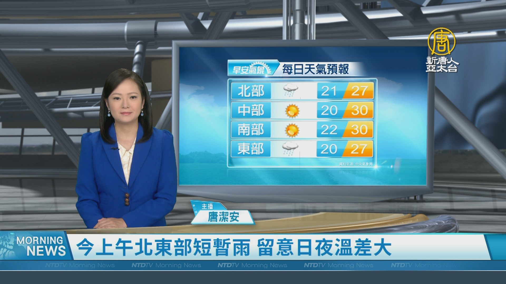 【新唐人亞太台 2022 年 11 月 16 日訊】歡迎您收看11月16日的早安新唐人,我是唐潔安,先來帶您關心天氣。今天水氣較多,迎風面的桃園以北、東半部雲量偏多,而且有零星短暫雨,白天高溫桃園以北及東半部為25至27度,新竹以南,則可以來到28至31度,不過,日夜溫差較大,請觀眾朋友多加注意。帶您一起來看到國際媒體重要訊息。
