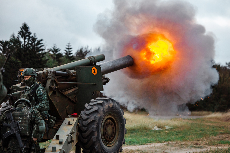 澎湖防衛部16日展開例行性鎮疆操演,完全以想定狀況誘導部隊,依敵軍作戰進程實施射擊,包括105、155榴砲及120迫擊砲、50機槍及T74機槍及 M6OA3戰車等火砲,展現防區精實訓練成果及堅強戰力。(圖/澎湖防衛部提供)