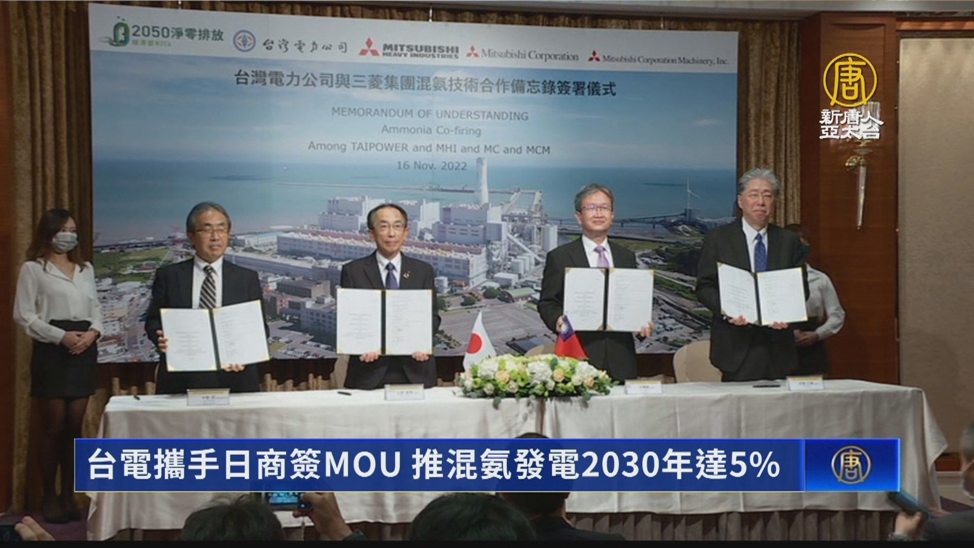 【新唐人亞太台 2022 年 11 月 16 日訊】迎接全球淨零轉型趨勢,台電今天與日本企業簽署一份合作備忘錄,將在林口電廠首度推動燃煤混氨發電。目標2030年前,達到燃煤混氨5%發電示範,林口電廠年減碳量達9000噸。