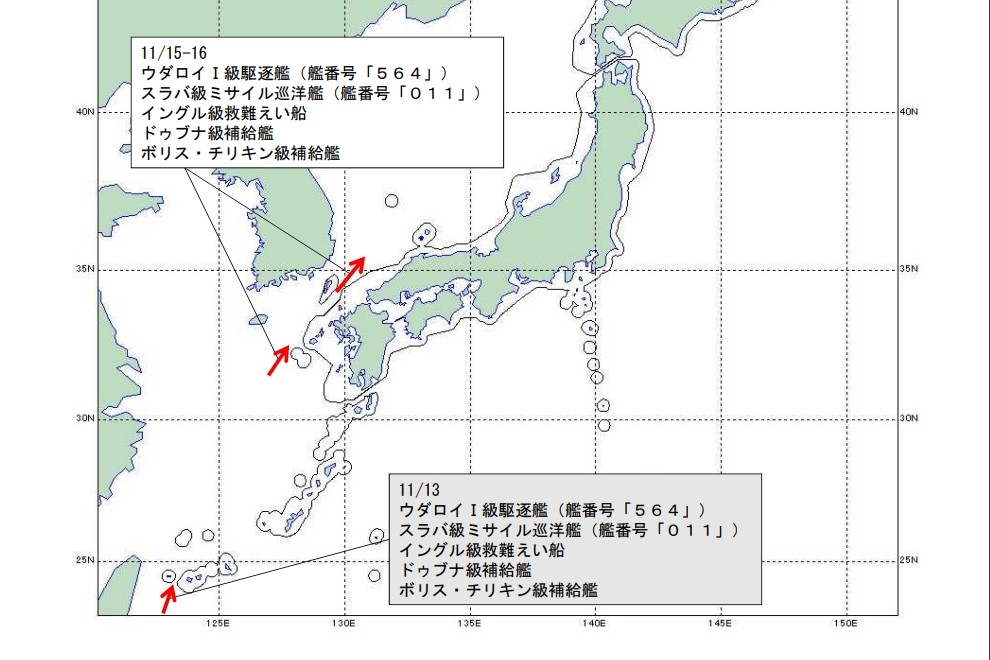 日本防衛省統合幕僚監部新聞稿指出,日本海上自衛隊於15日下午3時(台灣時間15日下午2時)在長崎縣男女群島西方80公里的海域發現朝東北向航行的俄羅斯海軍光榮級飛彈巡洋艦「瓦良格號」、無畏級驅逐艦「特里巴特斯海軍上將號」與1艘救難艦、2艘補給艦共5艘俄國海軍艦艇。