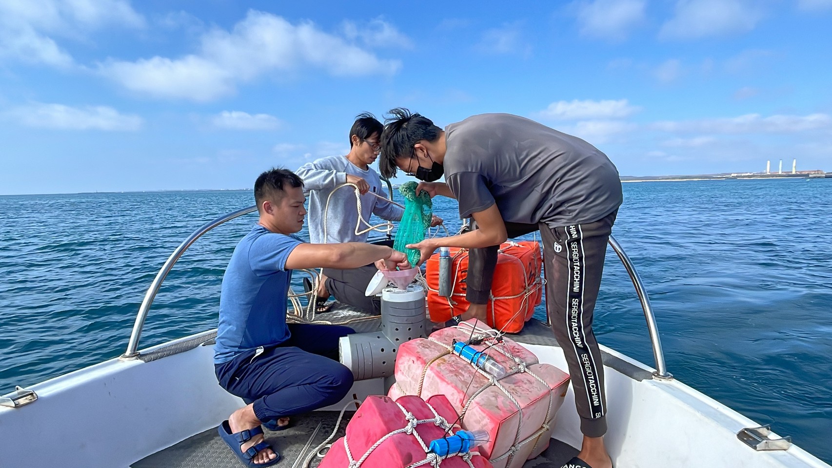 2022年11月17日,水試所澎湖海洋生物研究中心在龍門裡正角約5-7米深海域,以三歧管放流近4萬顆銀塔鐘螺稚螺。(圖/水試所澎湖海洋生物研究中心提供)