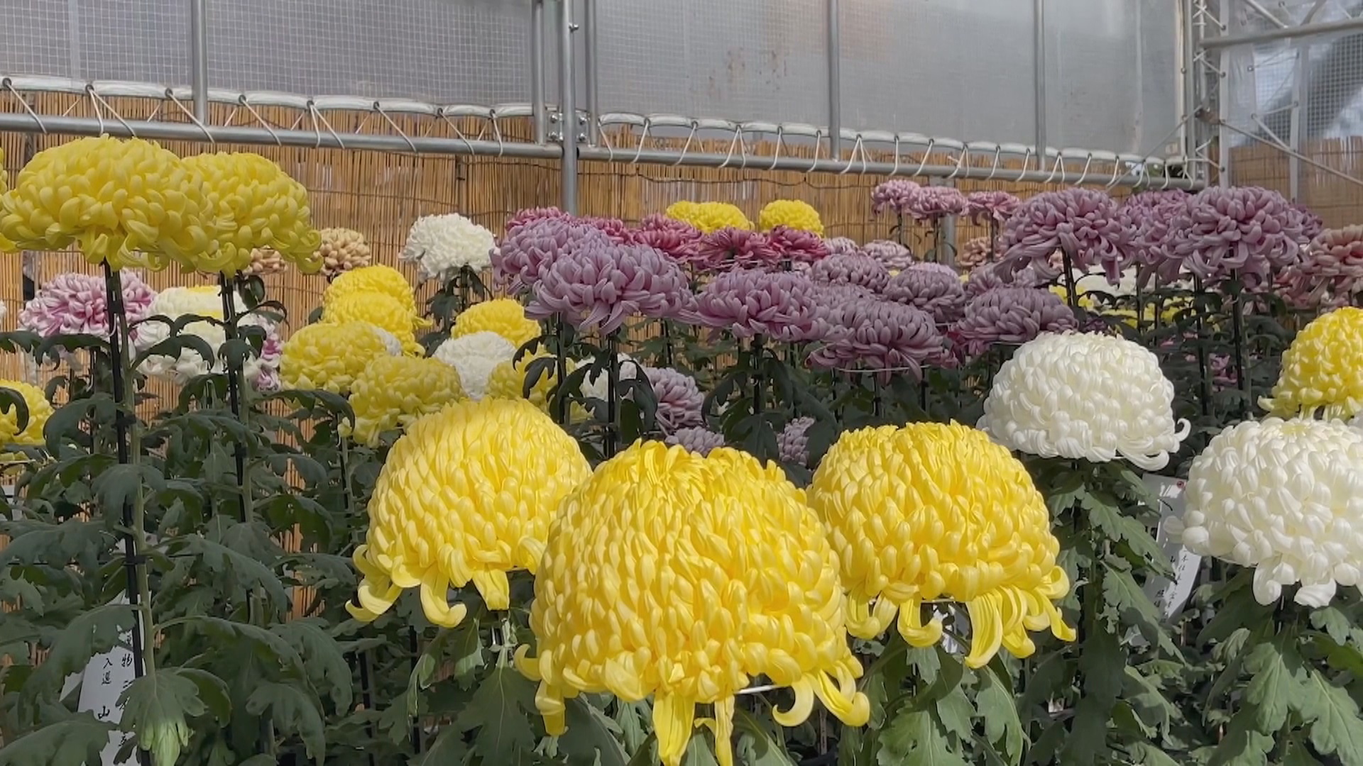 乳白色、黃色、淺粉色、粉紅色等各種顏色的厚物菊花,優雅綻放。花瓣紋路清晰、朝向花芯簇擁著開放。管物菊花,圍繞杯狀花芯,管瓣呈放射狀向外優美伸展、瓣尖捲曲並有彈性。懸崖造型的菊花,花朵均勻分布在花的根部與枝頭,展現出頑強的生命力。