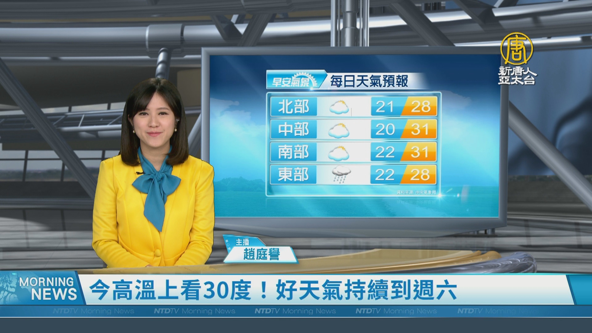 【新唐人亞太台 2022 年 11 月 18 日訊】歡迎您收看11月18日的早安新唐人,我是趙庭譽,先來帶您關心天氣。今天全台高溫約在攝氏27度到30度之間,體感溫暖微熱。好天氣預計會持續到星期六,預計東北季風將在星期天略為增強,降雨區域及強度也會提高。帶您一起來看到國際媒體重要訊息。