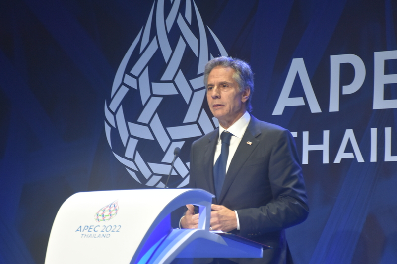 APEC部長級會議17日在曼谷登場,美國國務卿布林肯17日晚間在APEC會場的媒體中心舉行記者會,他提及將在112年訪問中國,並加深美中雙方的溝通。(圖/中央社)