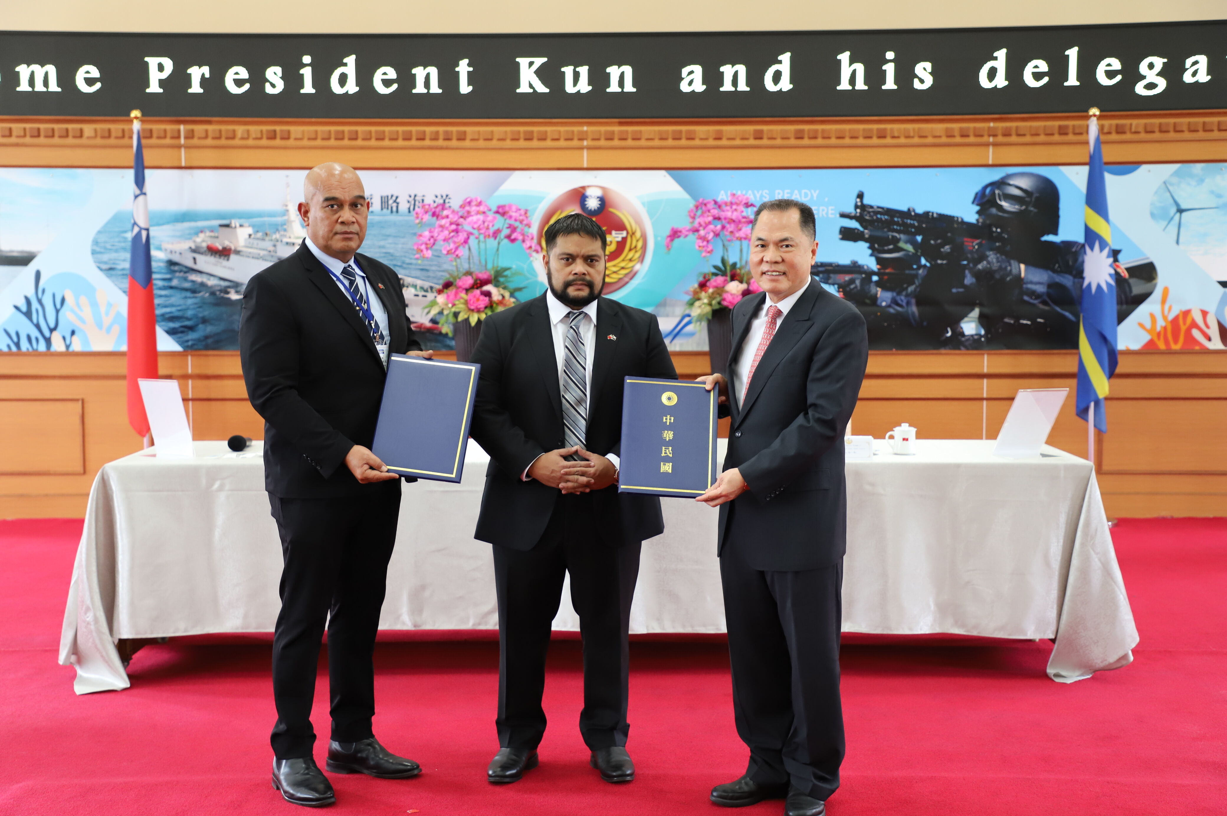 諾魯共和國總統昆洛斯(圖中)(Russ Joseph Kun)訪台。圖為由海洋委員會周美伍代理主任委員(圖右)和諾國警察總監(圖左)交換正式文本之後合影。(圖/海巡署提供)