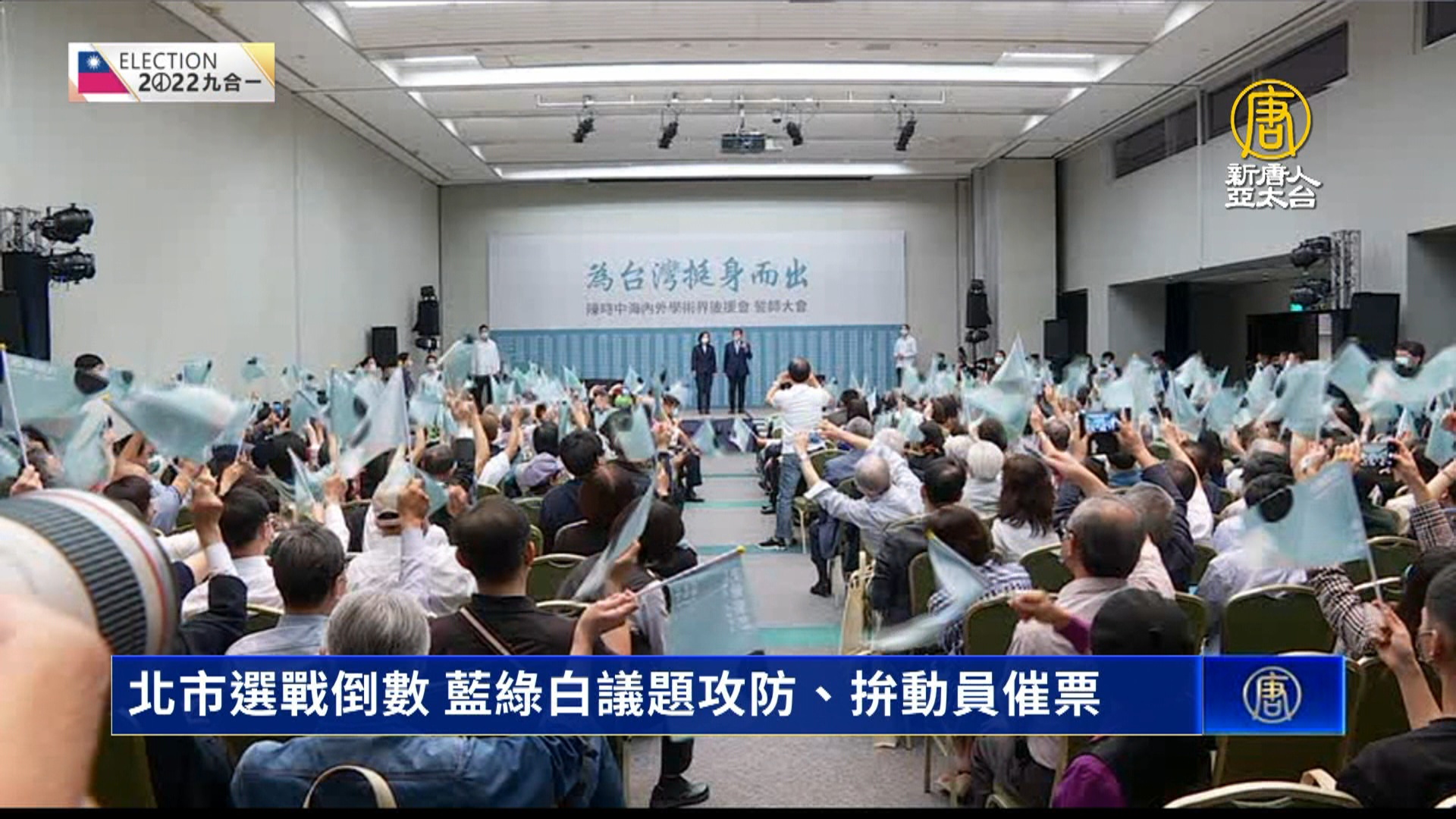 【新唐人亞太台 2022 年 11 月 19 日訊】北市選戰倒數,千名海內外學者挺陳時中,今天(19日)舉辦誓師大會,黨主席蔡英文同台催票。蔣萬安與黃珊珊則是分別密集掃街。藍綠白議題攻防,包括陳時中炒房話題、還有黃珊珊被質疑動員公務員造勢等,都成為焦點。