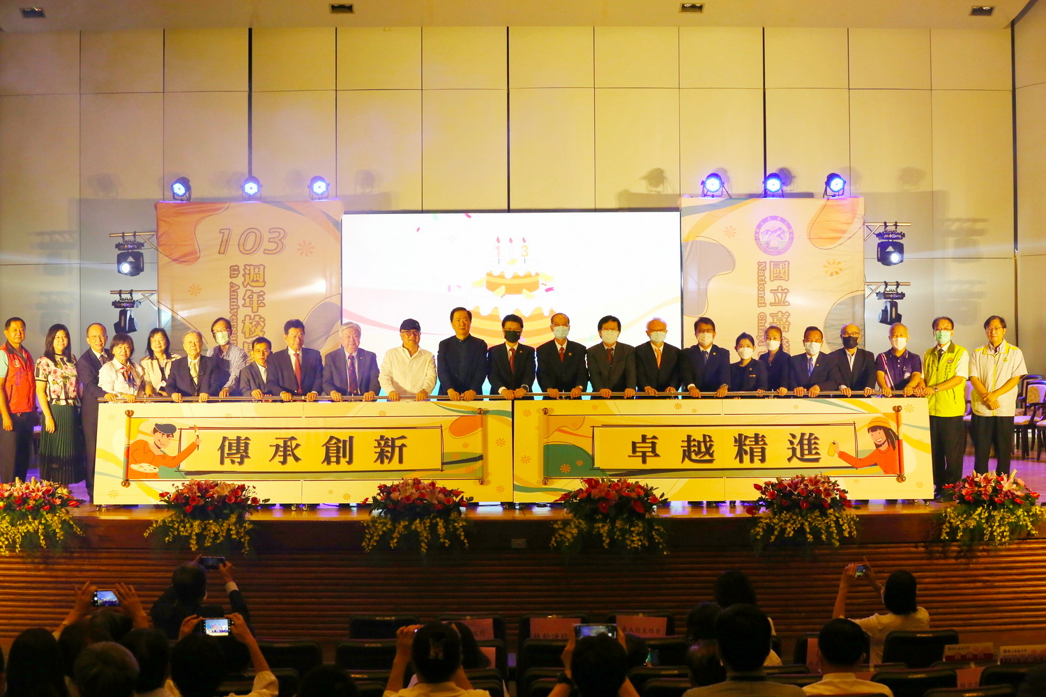 嘉大今天(19日)舉行103週校慶典禮,歷任校長及貴賓啟動校慶主題「傳承創新 卓越精進」卷軸。(嘉義大學提供)