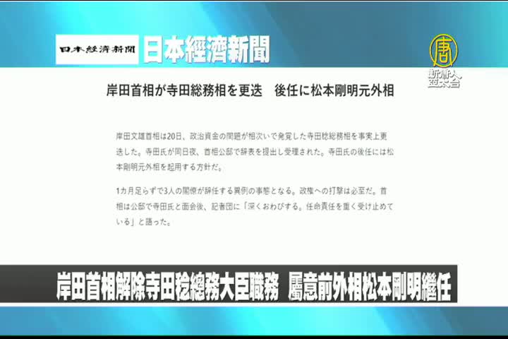 【新唐人亞太台 2022 年 11 月 21 日訊】來看到日本經濟新聞報導:日本首相岸田解除總務大臣寺田稔的職務,屬意前外相松本剛明,繼任新任總務大臣。