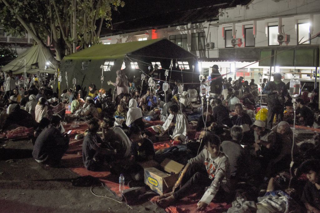 印尼電視台報導,席安約鎮的醫院外搭起簡易帳篷,展開緊急救治,許多傷患席地而坐,戴上氧氣罩和點滴接受治療。