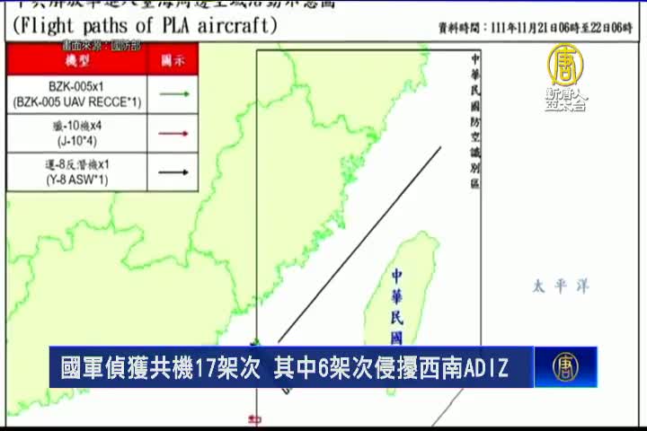 【新唐人亞太台 2022 年 11 月 22 日訊】共機持續擾台,據國防部今天指出,從昨天上午6點至今天上午6點止,總共偵獲共機17架次,其中有6架次侵擾台灣西南防空識別區,分別為1架次BZK-005無人機、4架次殲10戰機、1架次運8反潛機。另外還有共艦4艘次,持續在台海周邊活動。台灣國軍運用任務機、艦及岸置飛彈系統嚴密監控與應處。
