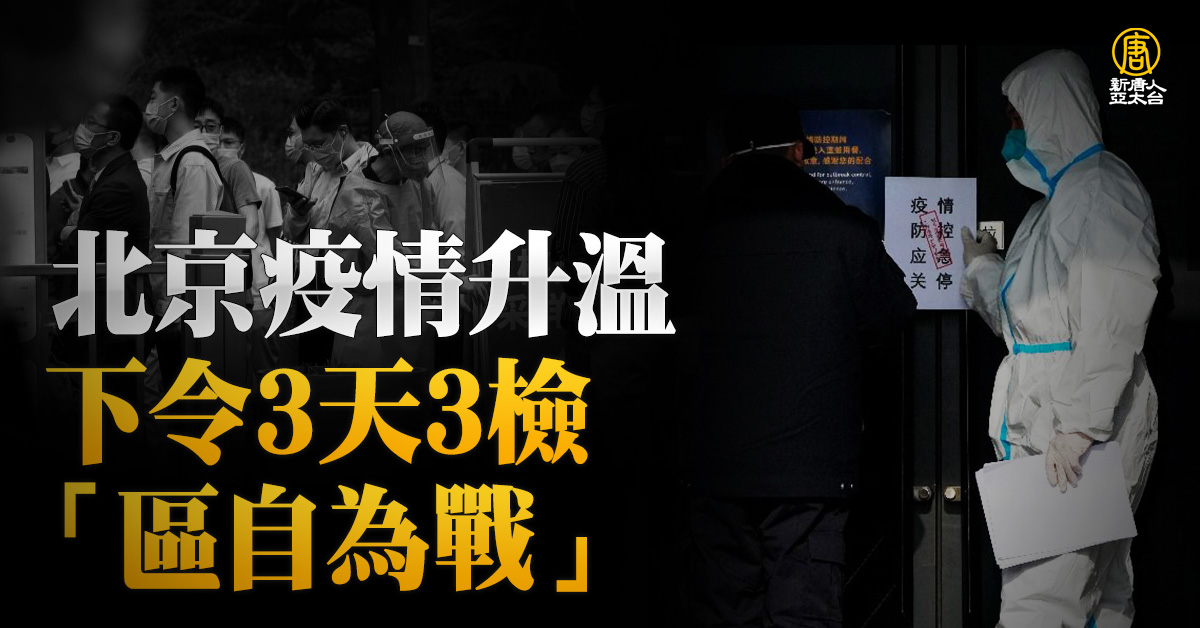 北京官方22日通報,自當日起對所有進返京人員實行核酸檢測3天3檢,居家隔離。24日起,進入公共場所或乘坐公共運輸工具,須持48小時核酸陰性證明。