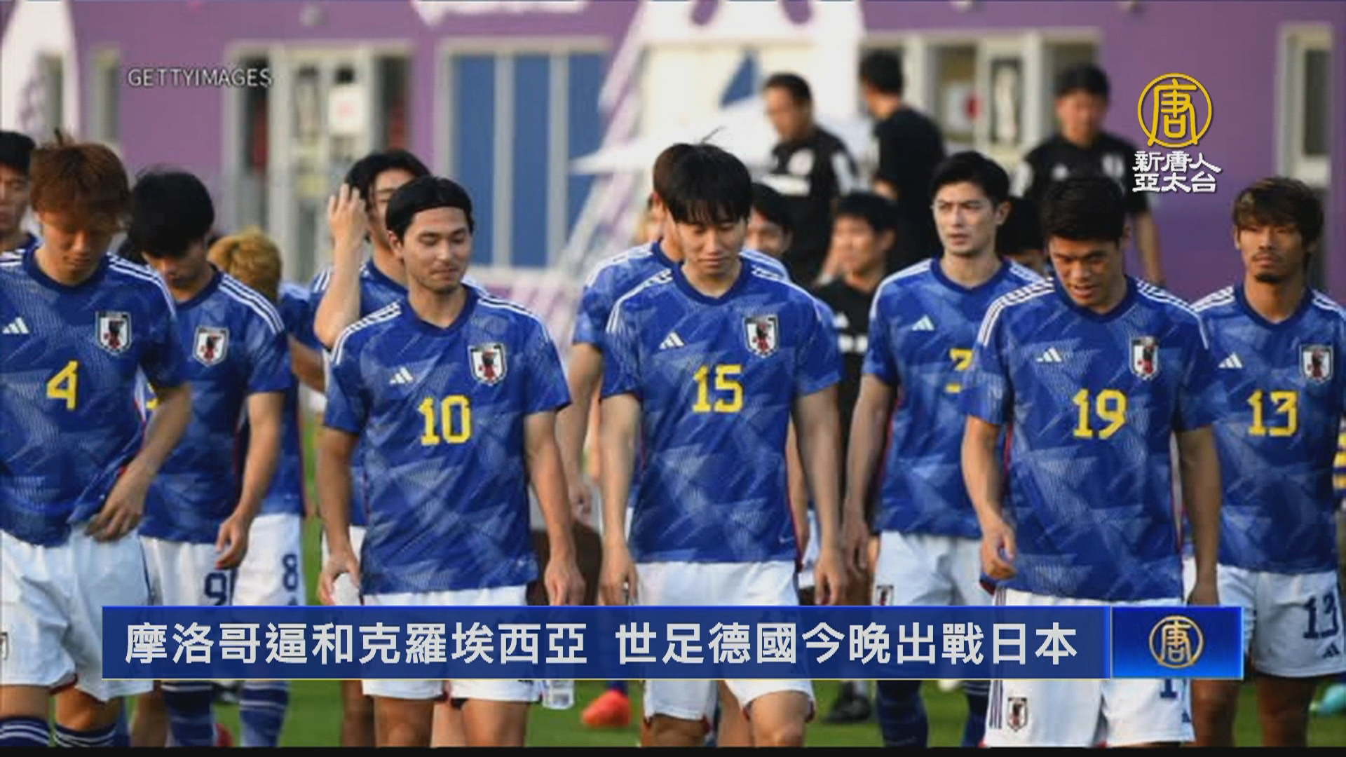 【新唐人亞太台 2022 年 11 月 23 日訊】歡迎回來。來看到,2022卡達世界盃足球賽,E組與F組今晚展開賽事,上屆亞軍克羅埃西亞晚間六點迎戰摩洛哥,兩隊最終以0比0和局收場,各收下1分的積分。台北時間晚間九點,德國將對戰日本,曾在世界盃4度奪冠的德國隊上屆在小組賽出局,今年力拚重返榮耀。日本隊尋求連2屆躋身16強,也力拚要首度闖入8強,希望締造隊史紀錄。此外,E組的歐洲強隊西班牙,將在凌晨0時出戰哥斯大黎加。