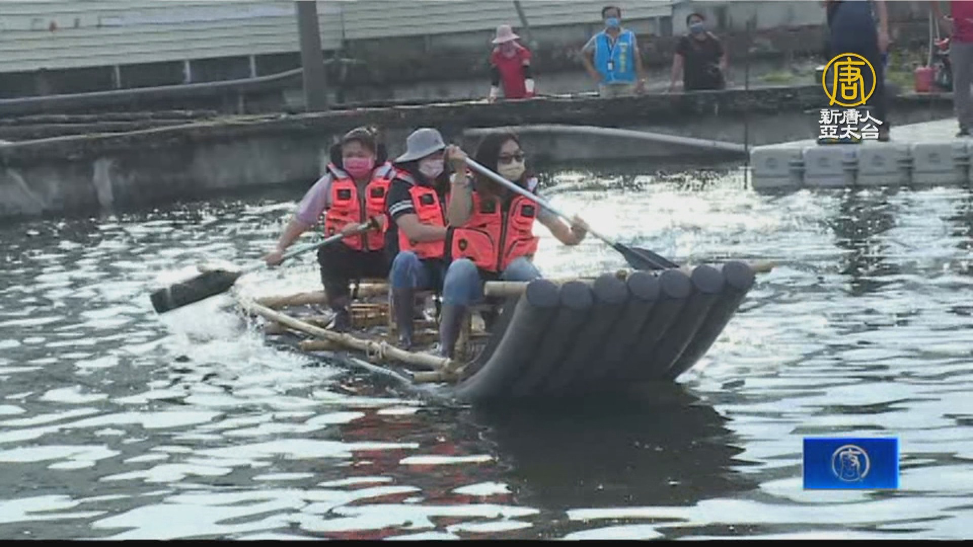 再來一場,在魚塭裡撐竹筏的撈球競賽。