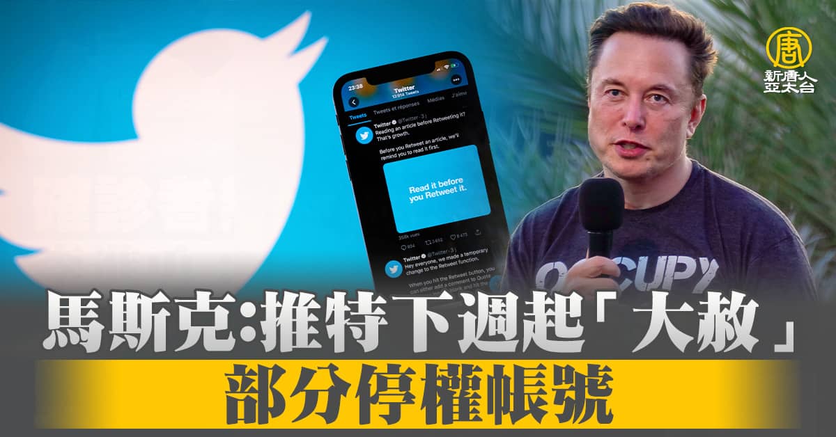 【新唐人亞太台 2022 年 11 月 25 日訊】社群媒體平台推特(Twitter)執行長馬斯克發起民意調查,想知道是否應「大赦」未違法或散布惡劣垃圾郵件的停權用戶。調查結束後,他今天說,下週將開始放行那些帳號。