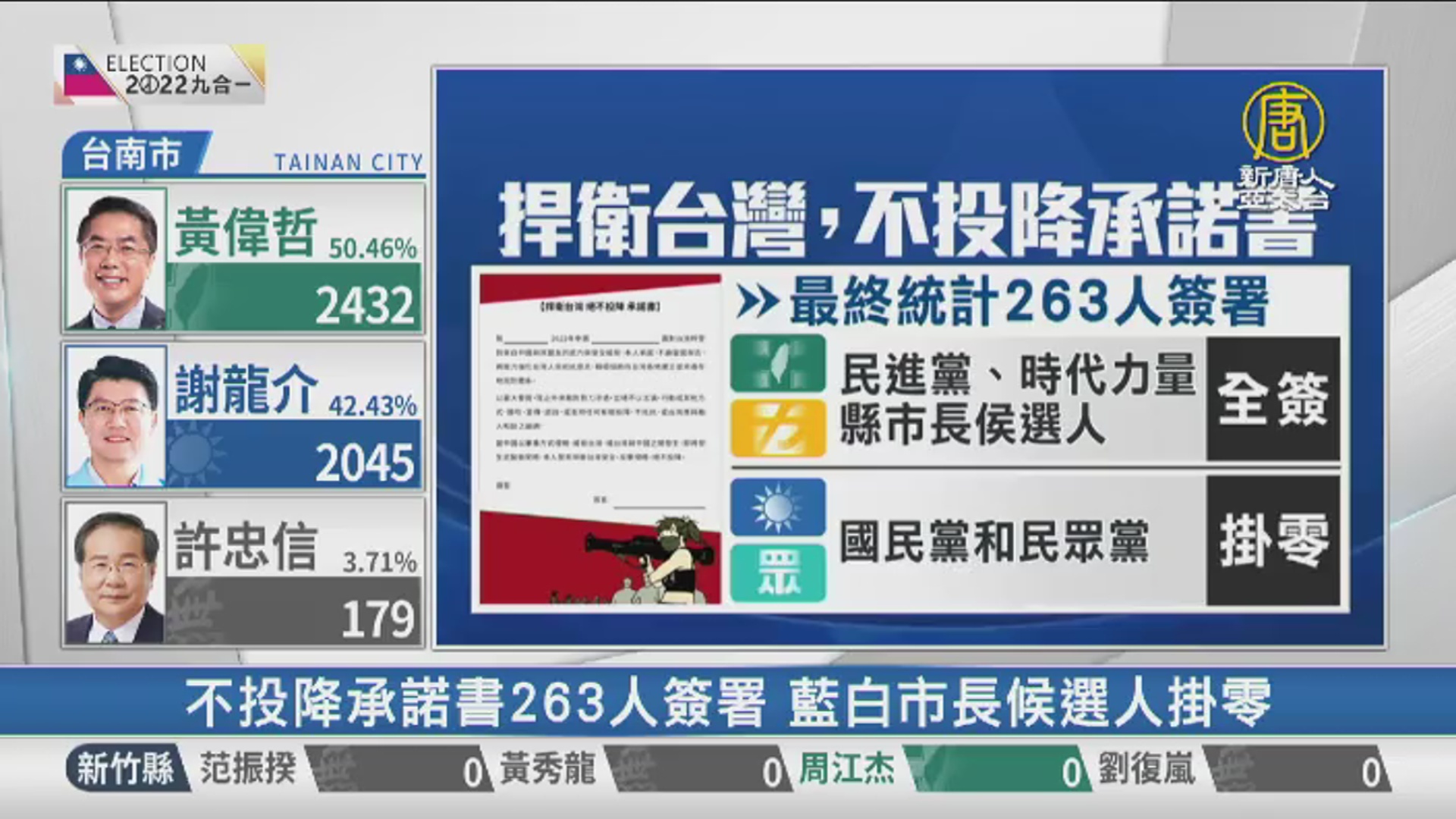 【新唐人亞太台 2022 年 11 月 26 日訊】由民間團體發起的「捍衛台灣,不投降承諾書」,呼籲九合一各地方公職候選人響應,最終統計有263人簽署。在六都市長候選人部分,共有9人簽署,非六都縣市長候選人則有18人簽署;其中民進黨、時代力量市長候選人全部都簽署;不過,國民黨和民眾黨候選人都沒有人連署。另外,在六都市議員候選人部分則有147人簽署。