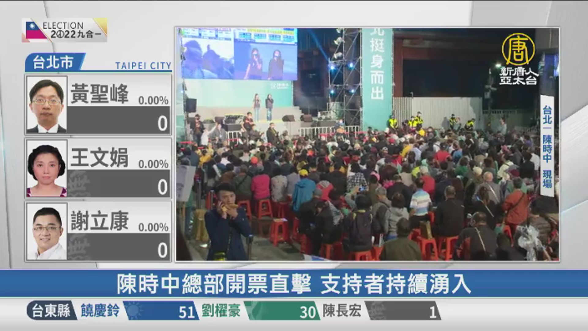 【新唐人亞太台 2022 年 11 月 26 日訊】好,票數持續開出,我們記者持續在現場為您守候,來看到,民進黨陳時中陣營,競選總部現場情況如何,交給在陳時中競選總部的記者,詠茹。