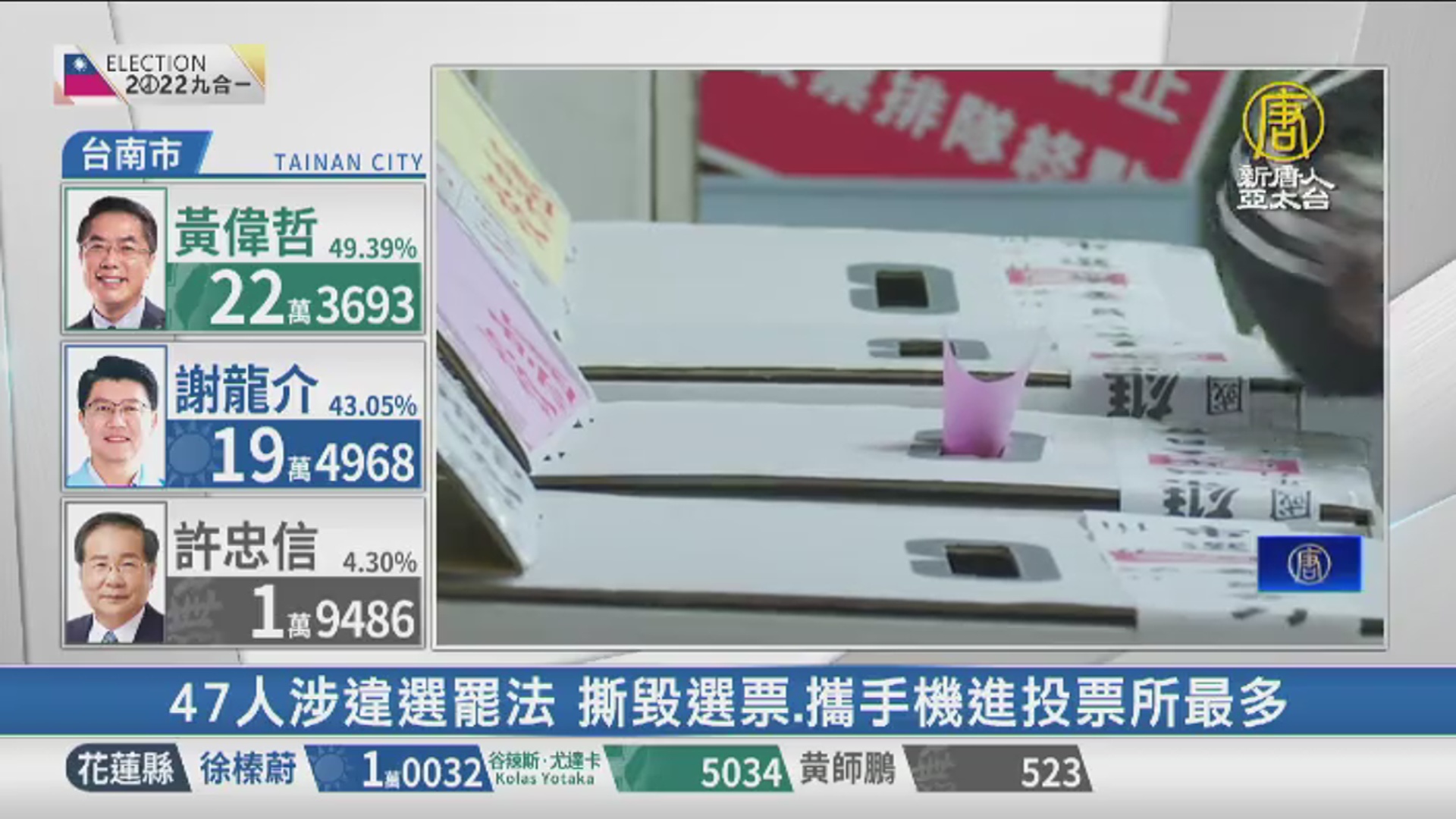 【新唐人亞太台 2022 年 11 月 26 日訊】再來看到,九合一地方公職選舉以及18歲公民權修憲公民複決投票日,今天登場(26日)。警政署統計,截至下午4點,全國涉違反選罷法共計70件72人。其中以撕毀、攜出選票37件39人,以及攜帶手機進入投票所24件24人較多。警政署也呼籲,請國人理性參與投票,配合選務作業,避免誤觸選舉法令,以共同維護這次選舉所代表的自由民主及法治價值。