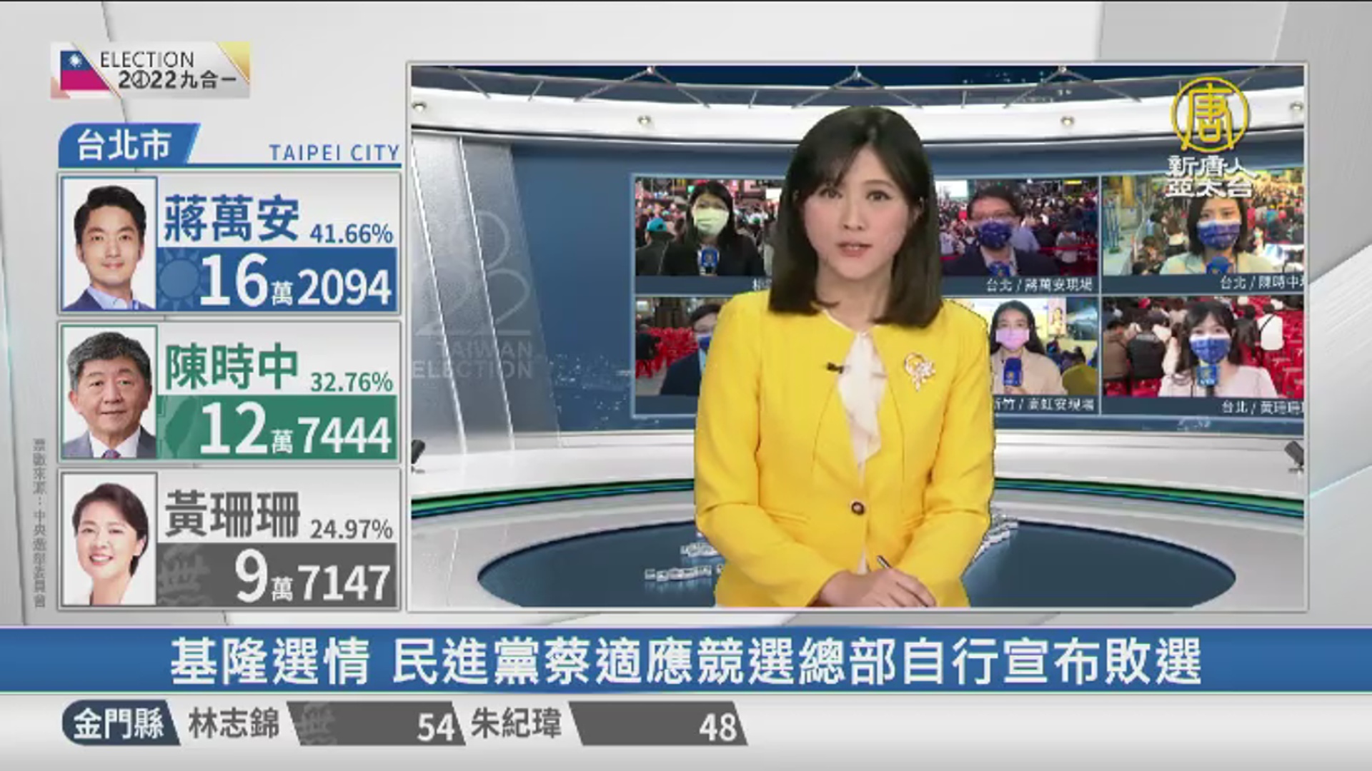 【新唐人亞太台 2022 年 11 月 26 日訊】再來看到基隆選情,國民黨候選人謝國樑稍早宣布當選,民進黨候選人蔡適應與太太,晚間6點到競選總部,自行宣布敗選。蔡適應鞠躬向選民致謝,並預祝對手可以帶領基隆市前進。