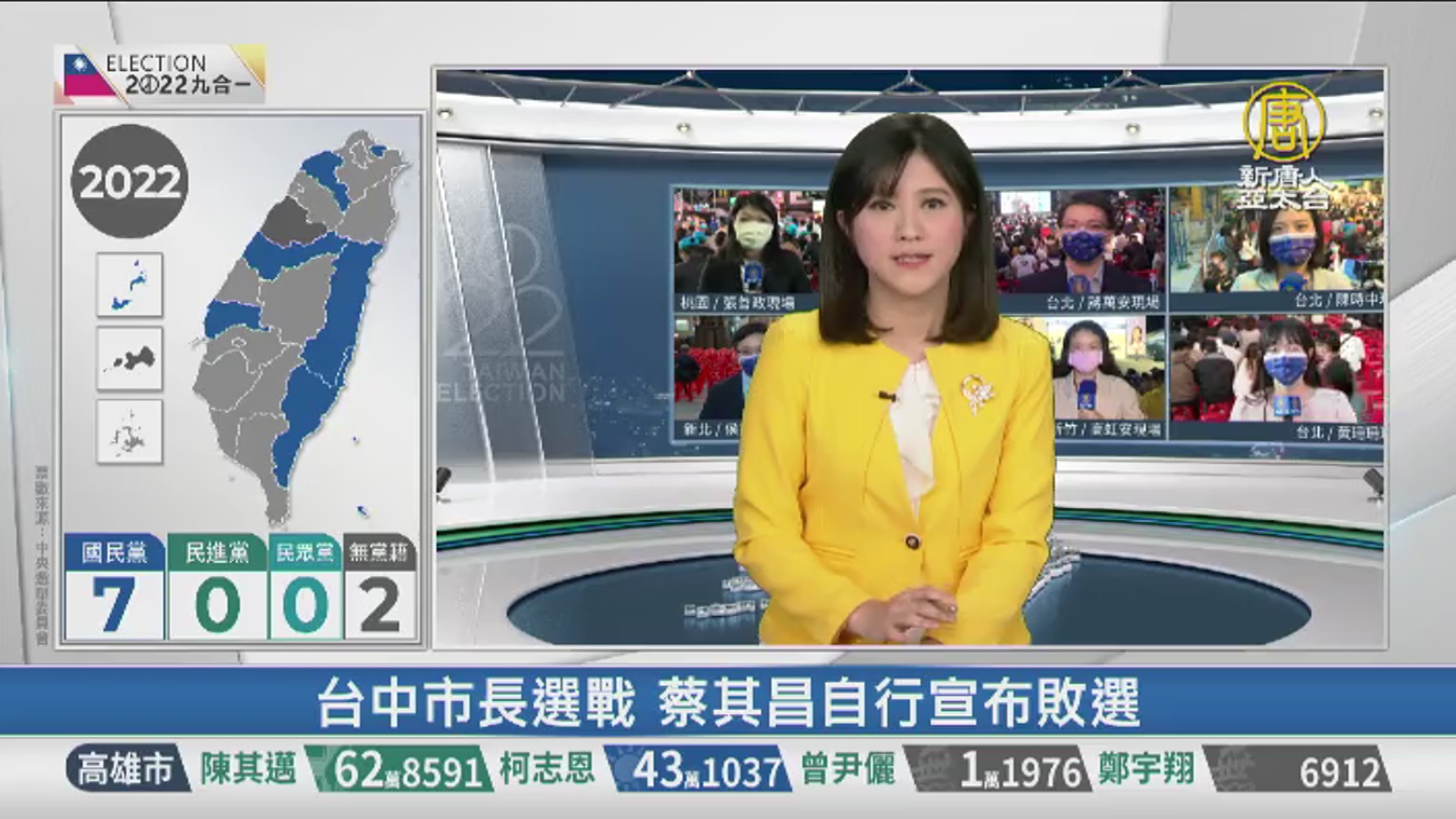 【新唐人亞太台 2022 年 11 月 26 日訊】中選會的九合一選舉開票作業仍在持續,但台中市長的開票結果已大致底定,依據中選會的數據,目前民進黨台中市長候選人蔡其昌的票數來到29萬2千2百88票,落後國民黨盧秀燕的44萬4千8百80票,晚間蔡其昌也在幕僚的陪同下,自行宣布敗選。