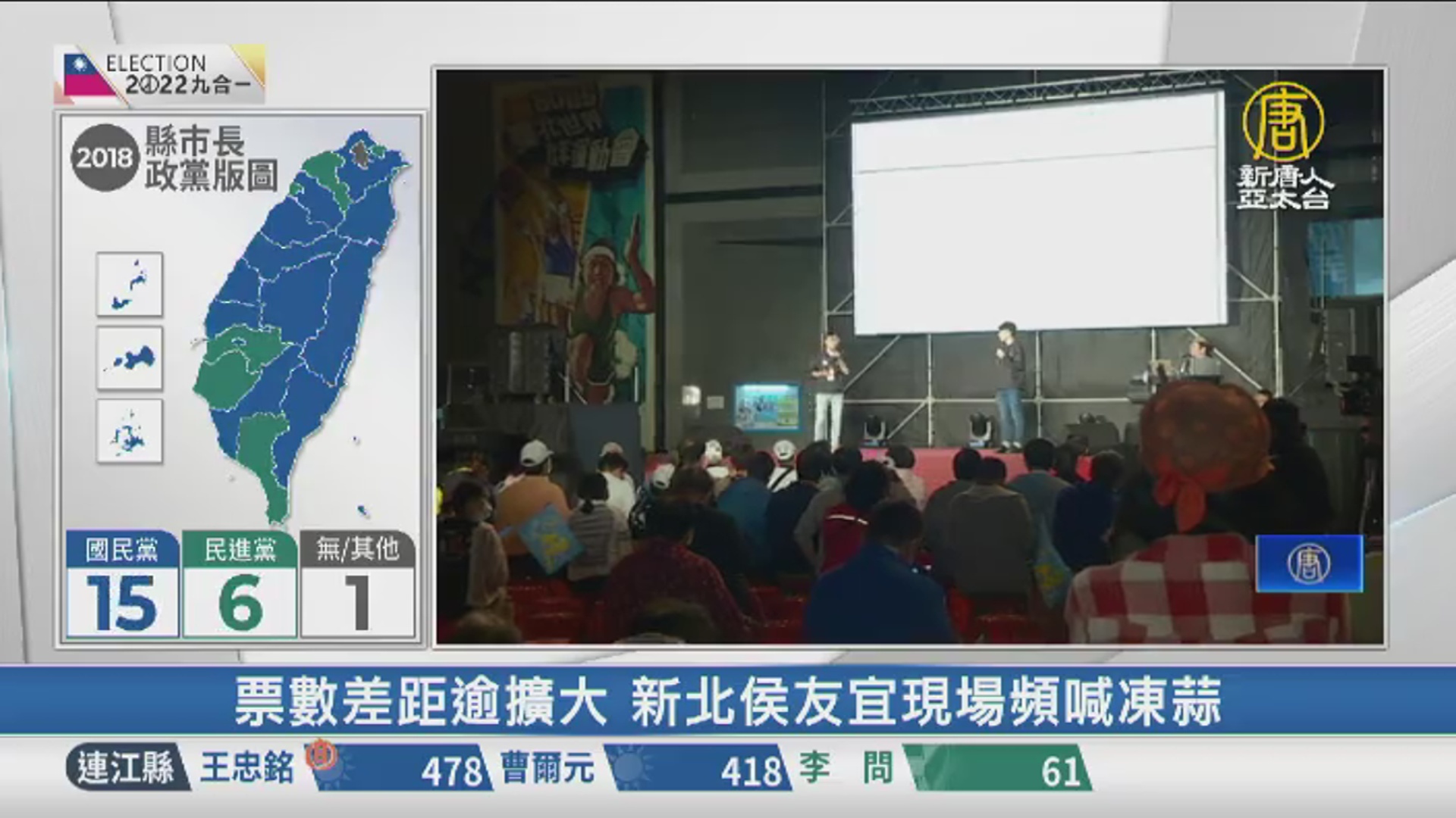 【新唐人亞太台 2022 年 11 月 26 日訊】目前票數陸續開出,新北市長選戰部分,國民黨候選人侯友宜,領先其對手民進黨候選人林佳龍,票數差距,超過2018年上次的九合一大選,也讓新北現場情況非常HIGH,我們來看到一下新北情況。