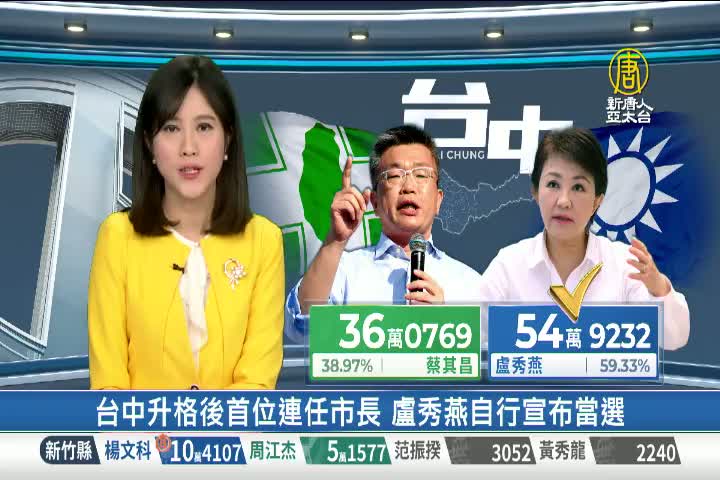 【新唐人亞太台 2022 年 11 月 26 日訊】中選會的九合一選舉開票作業仍在進行中,但台中市長的開票結果已經大致底定,依據中選會的數據,目前國民黨台中市長候選人盧秀燕的票數來到54萬9千2百3十2票,得票率為59.33%,晚間盧秀燕也在幕僚的陪同下,在開票之夜舞台上自行宣布當選,她將成為台中市升格後,首位連任的市長。