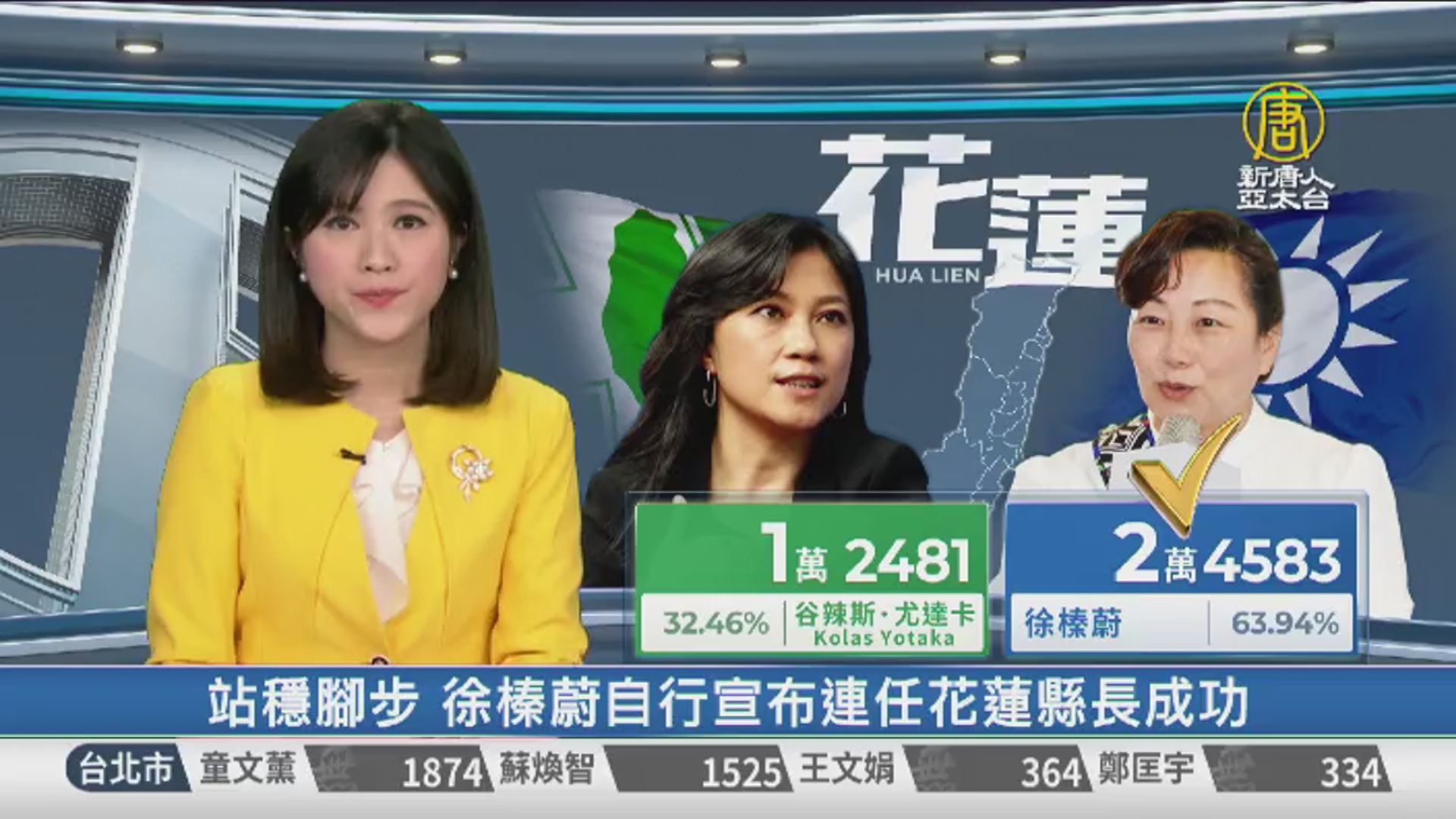 【新唐人亞太台 2022 年 11 月 26 日訊】花蓮縣長選舉開票作業還在進行中,但選舉結果已經呈現明朗,依據中選會的數據,目前國民黨花蓮縣長候選人徐榛蔚的票數來到2萬4千5百83票,晚間徐榛蔚也在支持者的期盼下,自行宣布成功連任花蓮縣長。