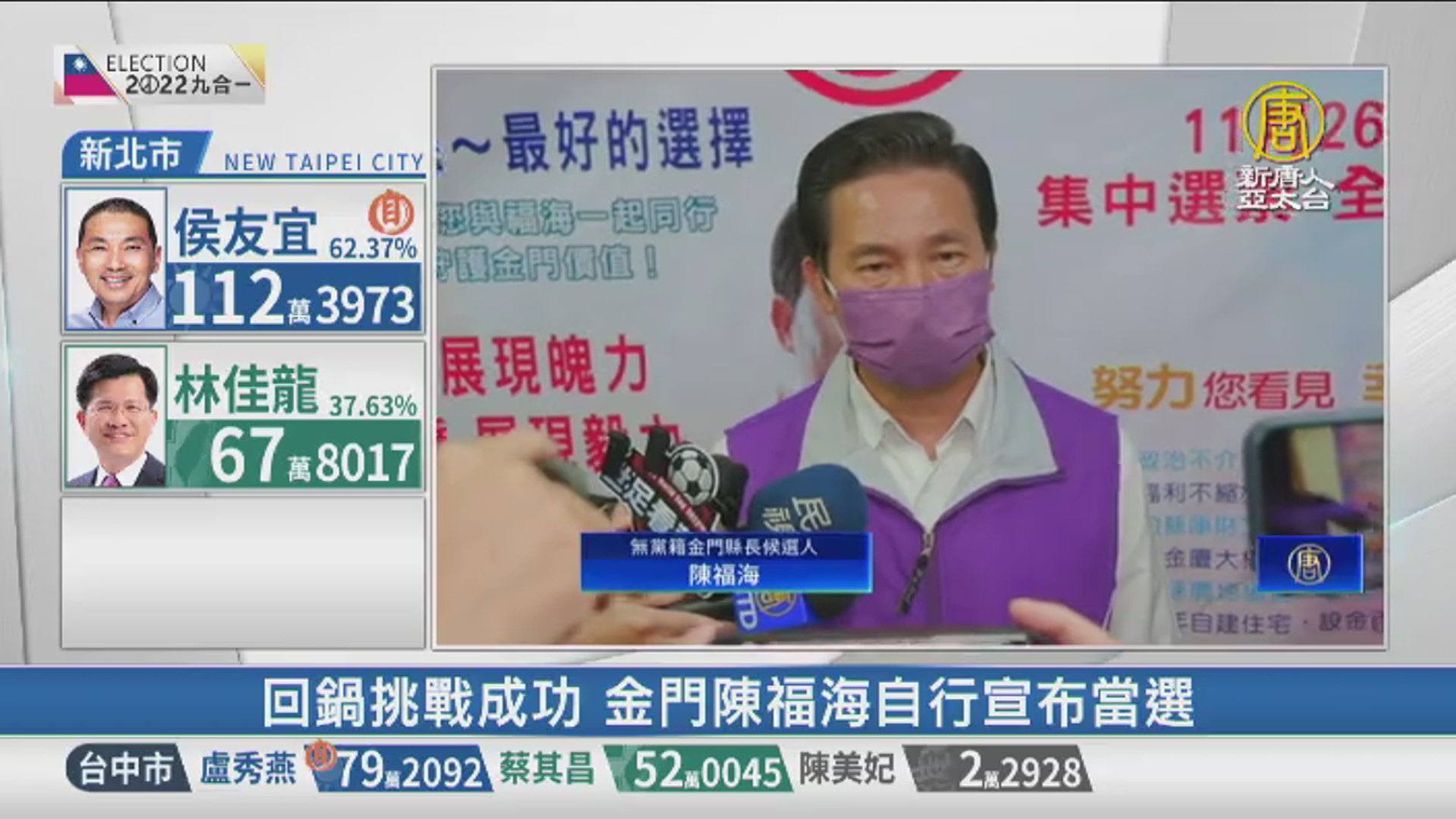 【新唐人亞太台 2022 年 11 月 26 日訊】金門縣長選舉結果再度變天,由回鍋參選的無黨籍金門縣長候選人陳福海東山再起,打敗尋求連任的國民黨籍現任縣長楊鎮浯。晚間六點四十分左右,陳福海在支持者的簇擁下,發表當選感言。