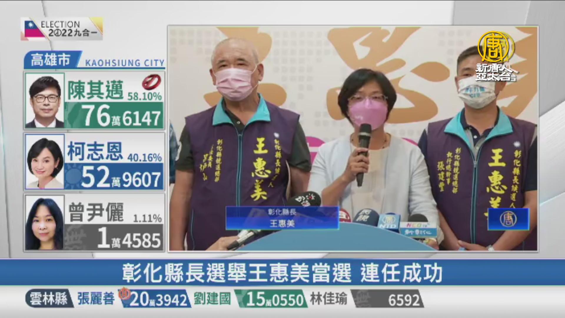 【新唐人亞太台 2022 年 11 月 26 日訊】競選連任的國民黨彰化縣候選人王惠美,領先對手黃秀芳9萬多票,王惠美在晚間7點40分已經在競選總部自行宣布當選,連任成功,帶您聽聽她的當選感言。