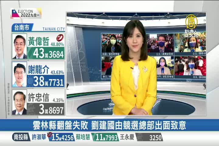 【新唐人亞太台 2022 年 11 月 26 日訊】民進黨雲林縣長候選人劉建國,不敵對手張麗善的現任優勢,開票後現任縣長張麗善一路領先。張麗善自行宣佈當選後,媒體在劉建國競選總部等候多時,劉建國遲遲未出面發言,最後僅由競選總部發言人出面簡短致意。