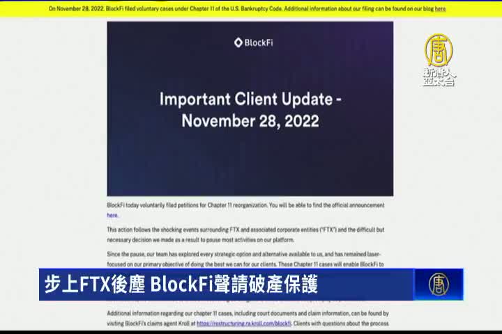 【新唐人亞太台 2022 年 11 月 29 日訊】加密幣交易所FTX破產之後,引發的連鎖效應持續延燒,市場傳出加密貨幣貸款平台BlockFi,28日已經聲請破產,這也成為又1家,步上FTX後塵的加密貨幣資產企業。外媒報導,根據BlockFi向法院提交的文件顯示,有超過10萬名債權人。目前公司手頭上大約2.57億美元(約新台幣85億1100萬元)現金,正在啟動內部計劃,大幅減少開支,包含人工成本。