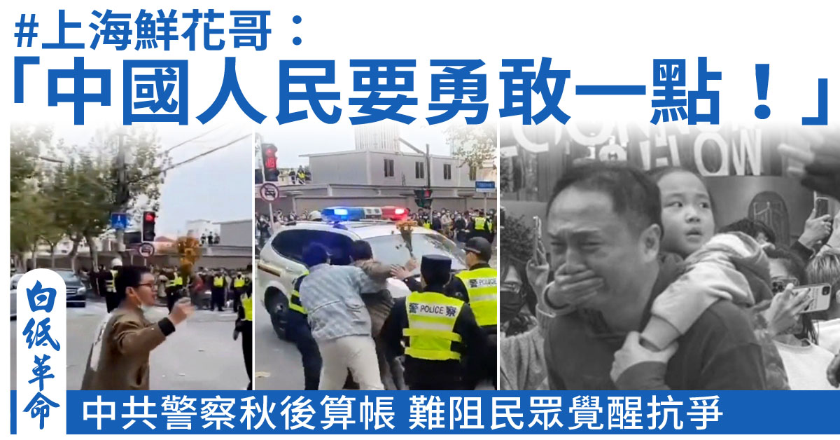 上海安福路口,一名男子曾因手舉鮮花過馬路,受到民眾的稱讚,卻被警察粗暴帶走。