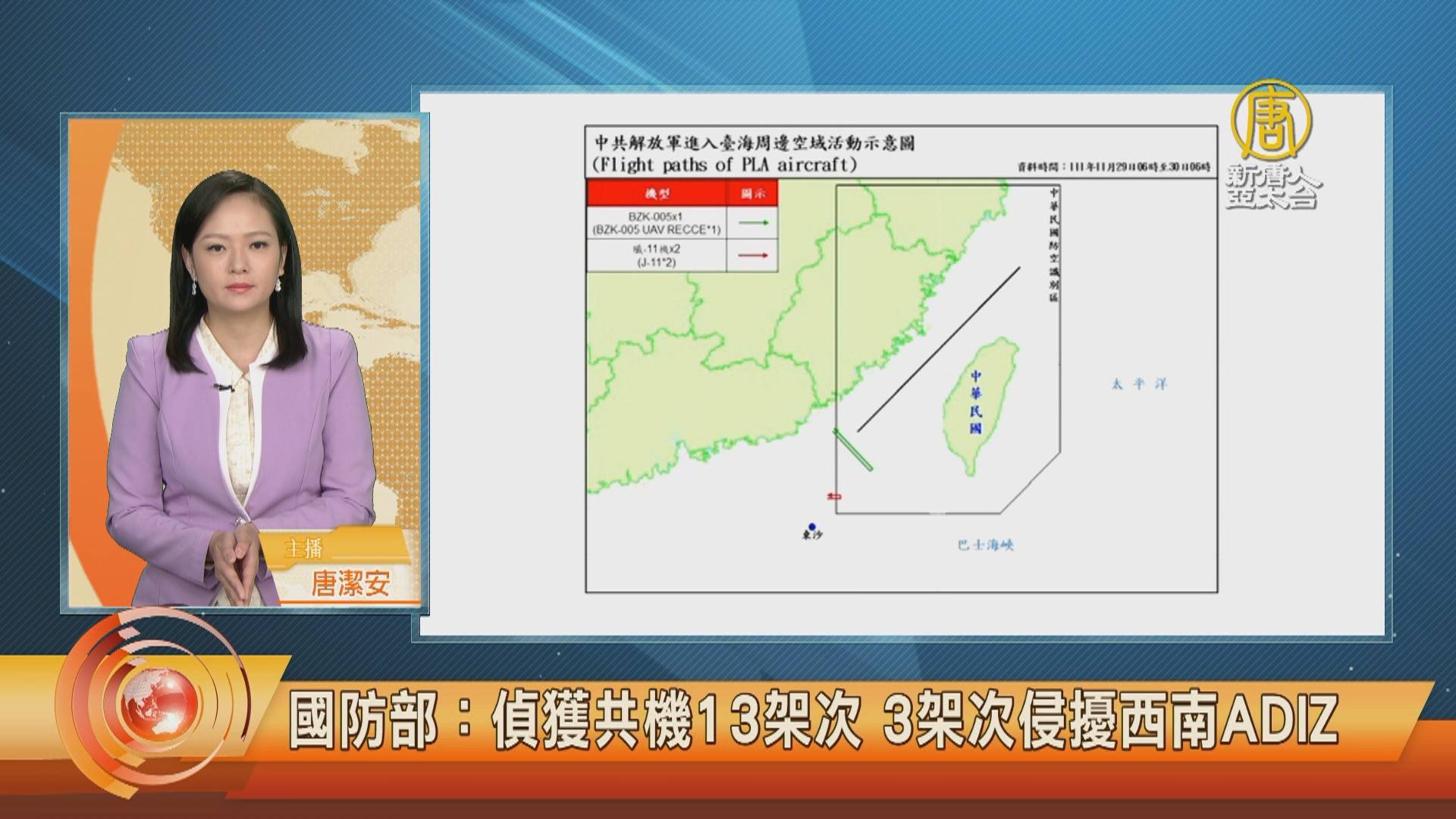 【新唐人亞太台 2022 年 11 月 30 日訊】中共升高對台海威脅,中華民國國防部今天指出,統計自昨天上午6點起至今天上午6點止,偵獲共機13架次、共艦3艘次,持續在台海周邊活動。國軍運用任務機、艦及岸置飛彈系統嚴密監控與應處。