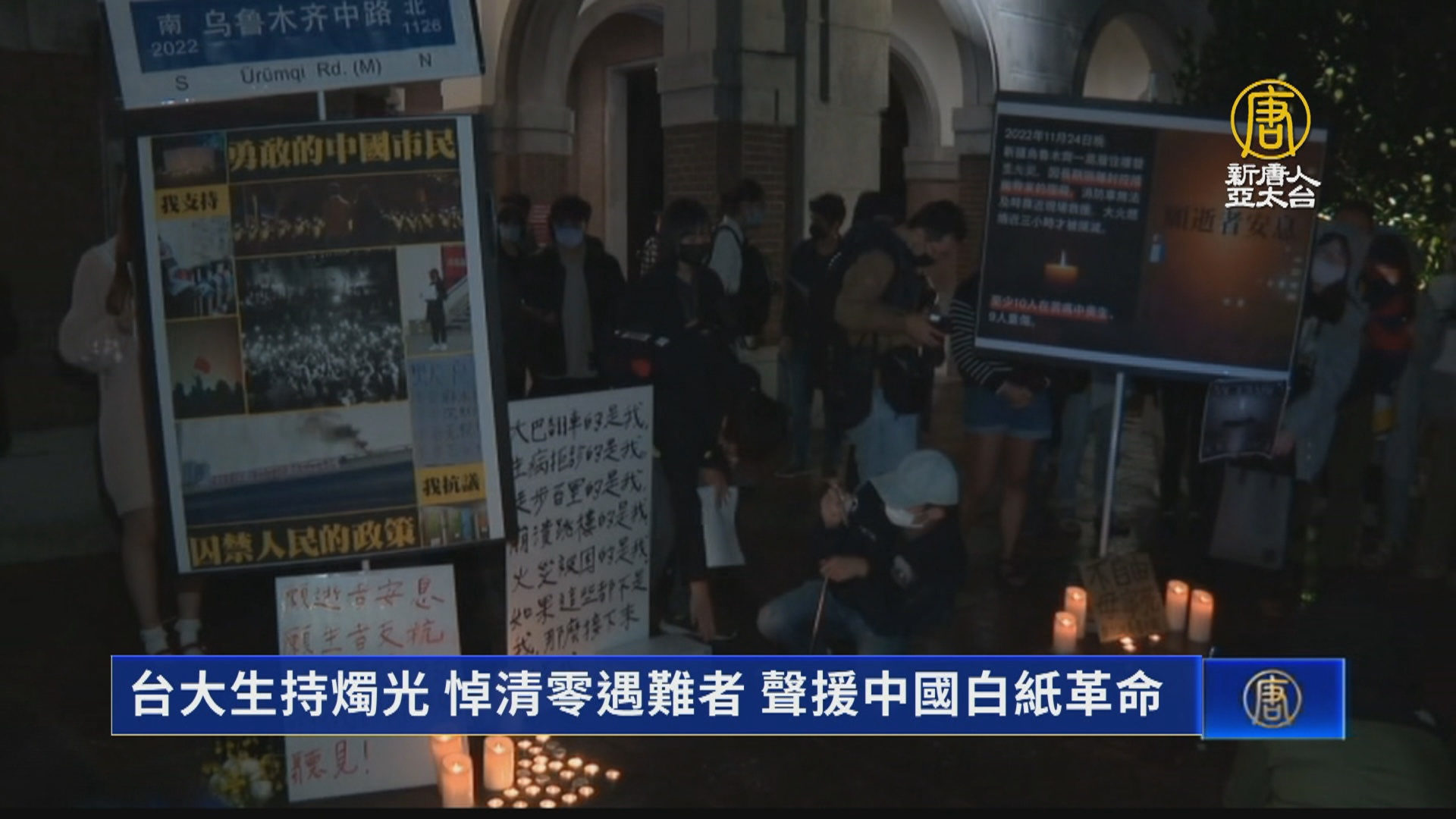 【新唐人亞太台 2022 年 11 月 30 日訊】歡迎回來。中國「白紙革命」持續延燒,中國大量呈市外多地城市,都有華人聚集,手舉白紙抗議。台灣的自由廣場,週日也發起聲援活動,手持蠟燭和白紙,為烏魯木齊大火罹難者哀悼。而今天在台灣大學圖書館前,台大學生也舉辦了燭光悼念會,聲援中國白紙革命抗議。