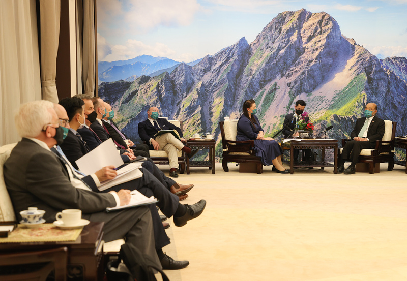 蘇貞昌下午接見訪團成員時致詞說,世界各國對台灣、台海和平以及半導體供應鏈等越來越重視,訪團此次前來,可以見證台灣在總統蔡英文領導下,如何因應疫情且發展經濟。