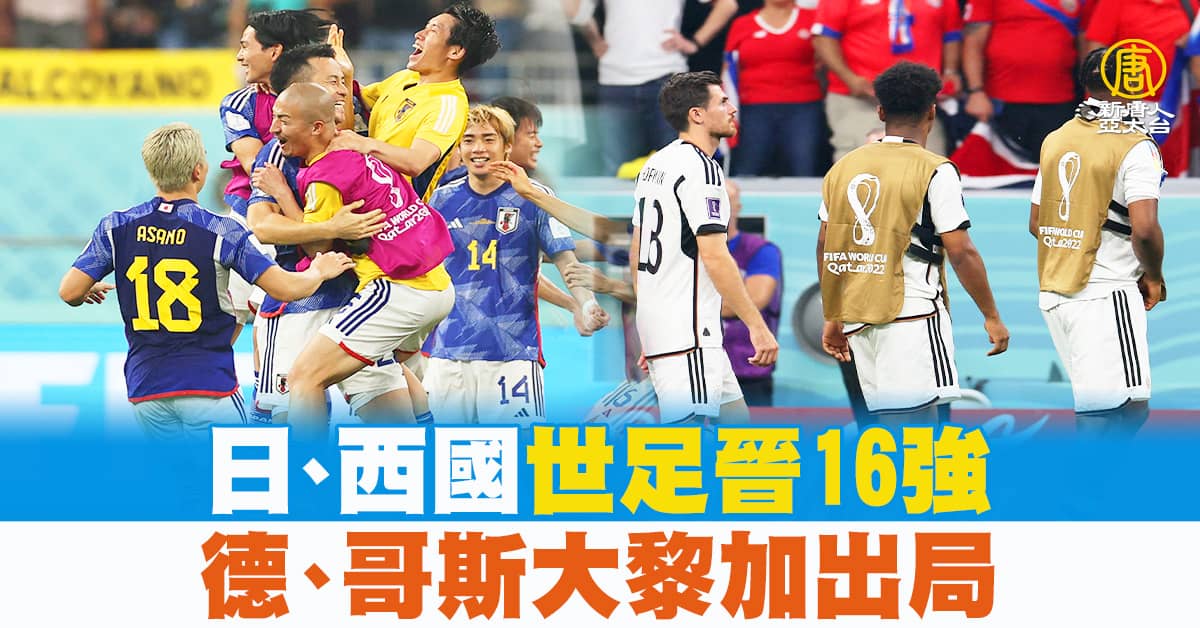 【新唐人亞太台 2022 年 12 月 02 日訊】歡迎回來,關心世足賽的最新戰況,台灣時間今天凌晨進行E組小組賽最後兩場賽事,日本以2比1力克西班牙,德國雖然以4比2踢贏哥斯大黎加,仍無緣晉級。最後E組由日本與西班牙晉級16強。外媒指出,日本隊上半場持球只有14%,但下半場局勢扭轉,球員堂安律跟田中碧在下半場6分鐘內攻進兩球逆轉,日本隊全場只有6次射門,3次射正就出現2個進球。而在德國的部分,雖然展現火力最終以4:2贏過哥斯大黎加,但比較淨勝球後,仍不敵西班牙,遭到淘汰,德國隊連續兩屆在小組賽就遭到淘汰。