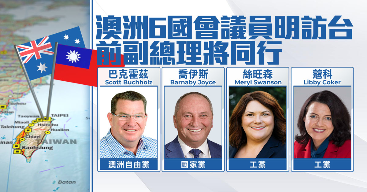 【新唐人亞太台 2022 年 12 月 03 日訊】新聞開始先帶您聚焦,中共打壓威脅之下,國際持續以行動支持台灣,繼英國下議院訪問團之後,澳洲6位跨黨派眾議員組成的訪問團,明天(4日)將啟程訪台5天,盼傳達澳洲希望維護印太區域和平之願。澳洲總理艾班尼斯今天也證實了這個消息,但稱此行並非由政府主導,根據澳洲媒體名單,6位眾議員訪團由巴克霍茲議員領銜,成員還有,曾任澳洲副總理的喬伊斯、絲旺森及蔻科。此團是三年來首個澳洲國會訪團,將拜會總統蔡英文及外交部長吳釗燮等我方政要,將就國防安全、貿易、農業等議題與台灣進行交流。