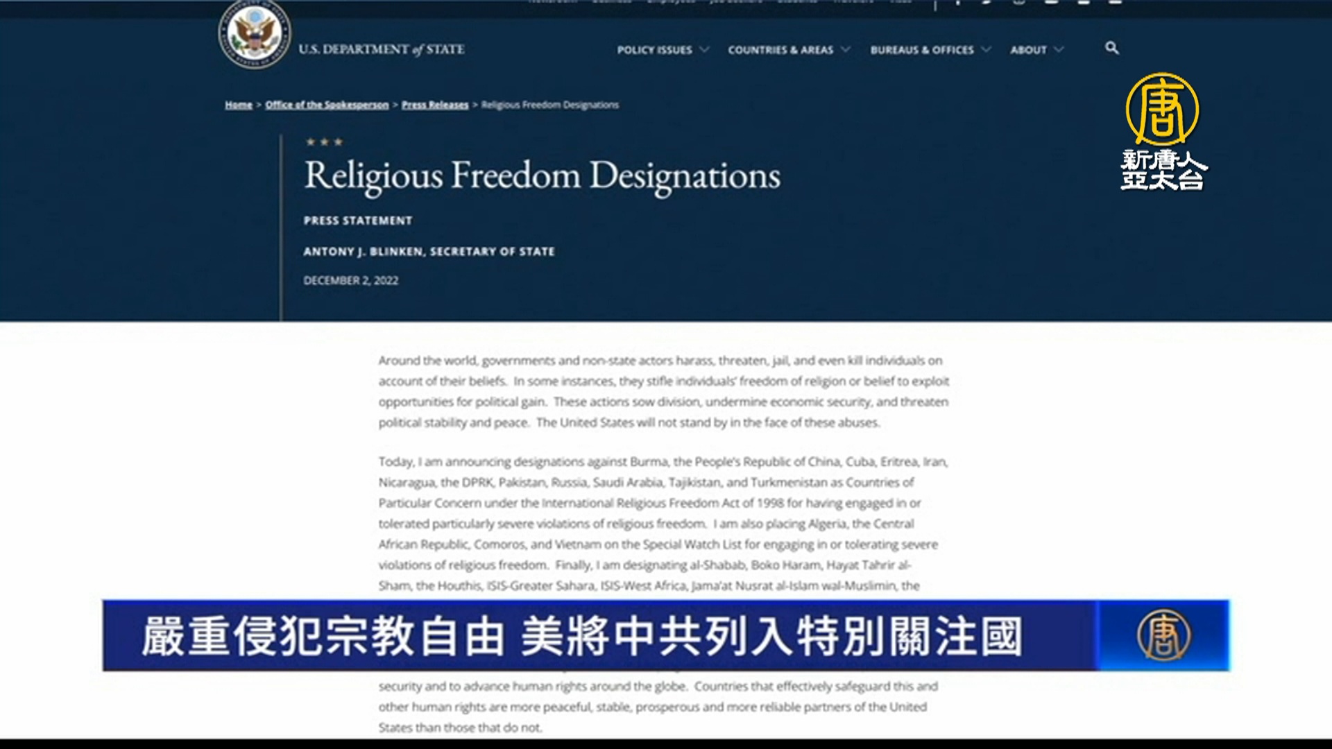 【新唐人亞太台 2022 年 12 月 03 日訊】美國國務卿布林肯12月2日發表聲明,根據《1998年國際宗教自由法》,中共再次因侵犯宗教自由,被列入特別關注國家名單。