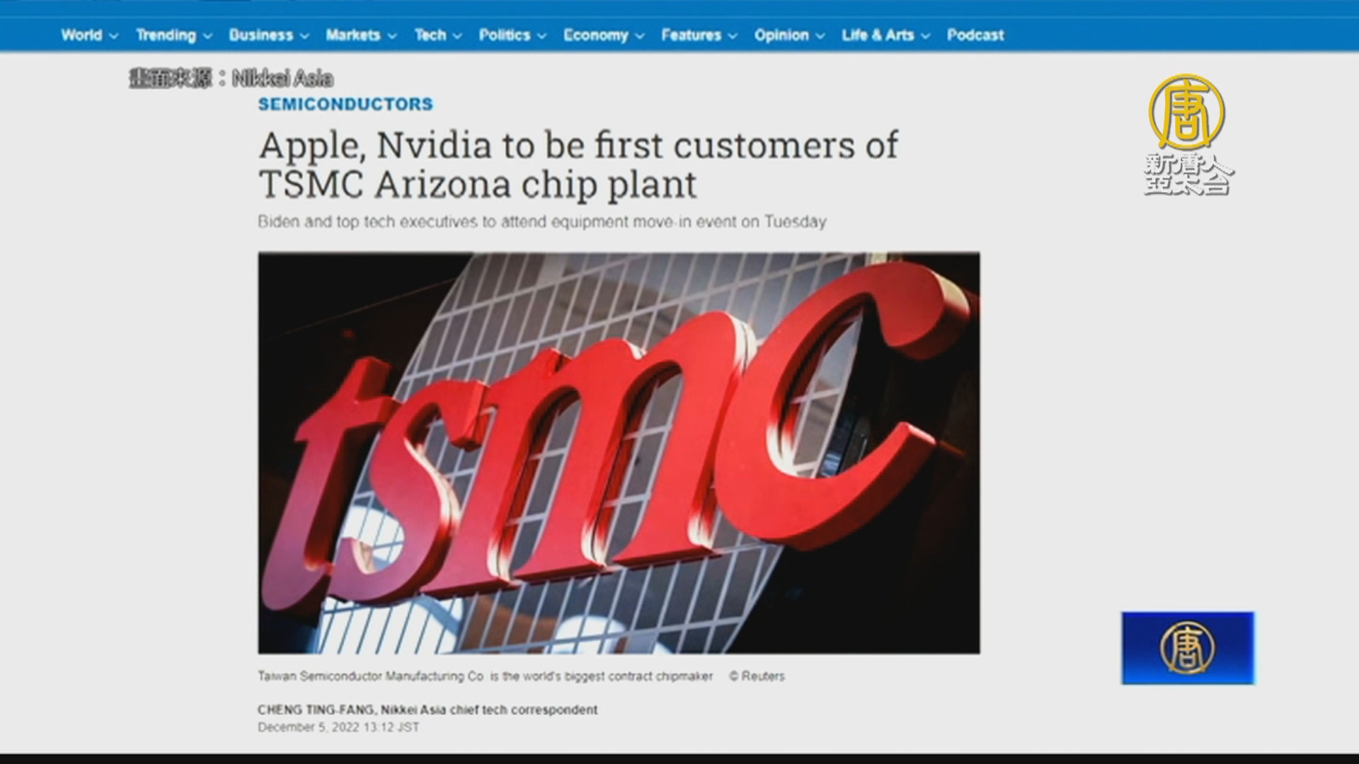 【新唐人亞太台 2022 年 12 月 05 日訊】台積電亞歷桑那州新廠最快明年底開始生產全球最先進晶片,日媒報導,蘋果和輝達兩家公司有望成為首批客戶,而處理器大廠美商超微與賽靈思據傳也在洽談中。台積電日前指出,亞利桑那州廠預計明年第一季進入裝機階段,第一期月產能將達2萬片,但日媒消息來源指出,台積電已經計畫將產量翻倍,在美國生產更多的先進晶片。