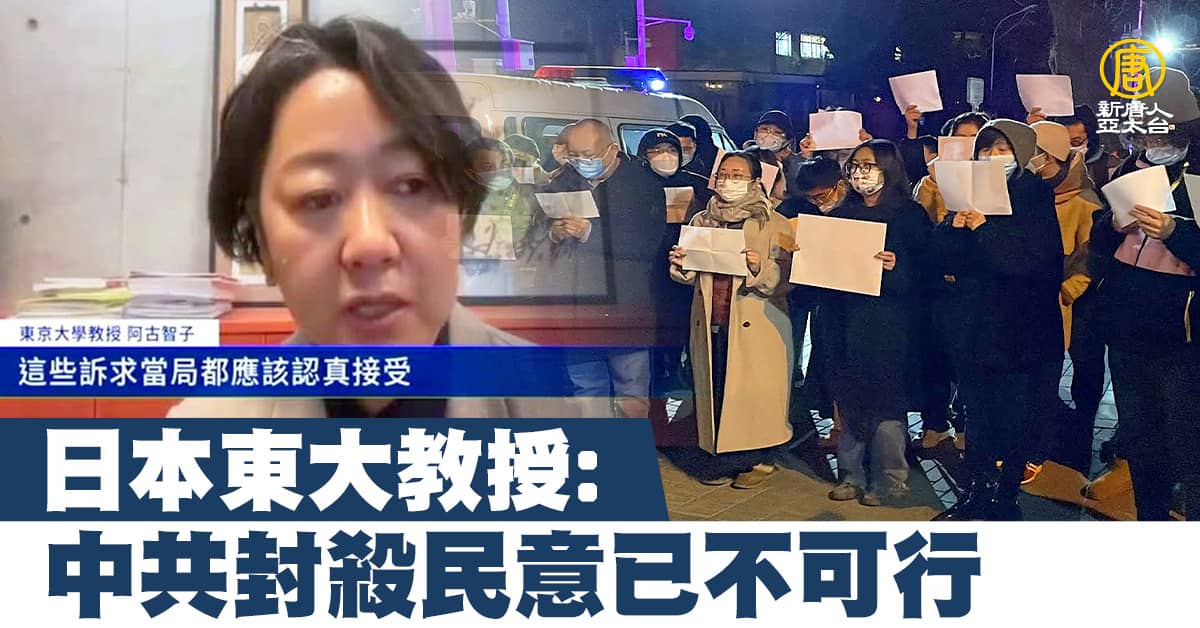東京大學教授 阿古智子:「在人權方面,無論一個國家是怎樣的政治制度,都應該保證國民擁有自由。現在中國人站出來呼籲『要自由、不要清零政策』,這些訴求當局都應該認真接受。同時國際社會也應該支援中國人追求民主自由。」