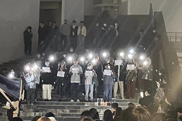 2022年11月26日晚,南京傳媒學院學生舉白紙抗議。(網路圖片)