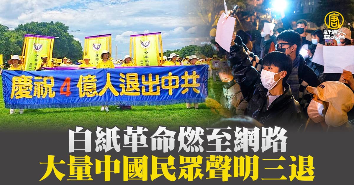 【新唐人亞太台 2022 年 12 月 06 日訊】最近爆發的「白紙革命」是六四之後中國最大規模的民眾抗議。不僅發生在街頭,校園,還延燒到網絡。海外退黨網站上連日收到大量民眾的聲明,退出中共黨團隊組織。