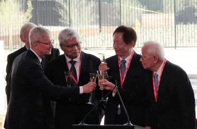 蘋果執行長庫克(左)出席台積電鳳凰城移機典禮,並與台積電創辦人張忠謀(右1)、董事長劉德音(右2)、總裁魏哲家(右3)舉杯祝賀。(圖/中央社)