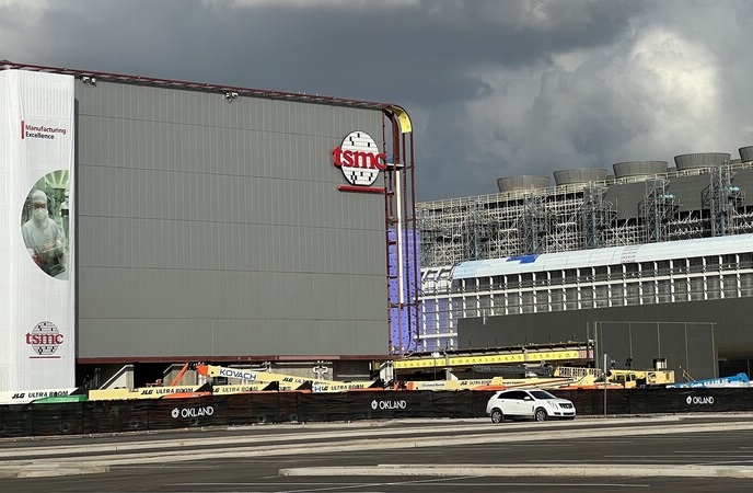半導體製造龍頭台積電在美國投資設置晶圓廠,6日舉行移機典禮,廠區首次對外迎接賓客。(圖/中央社)