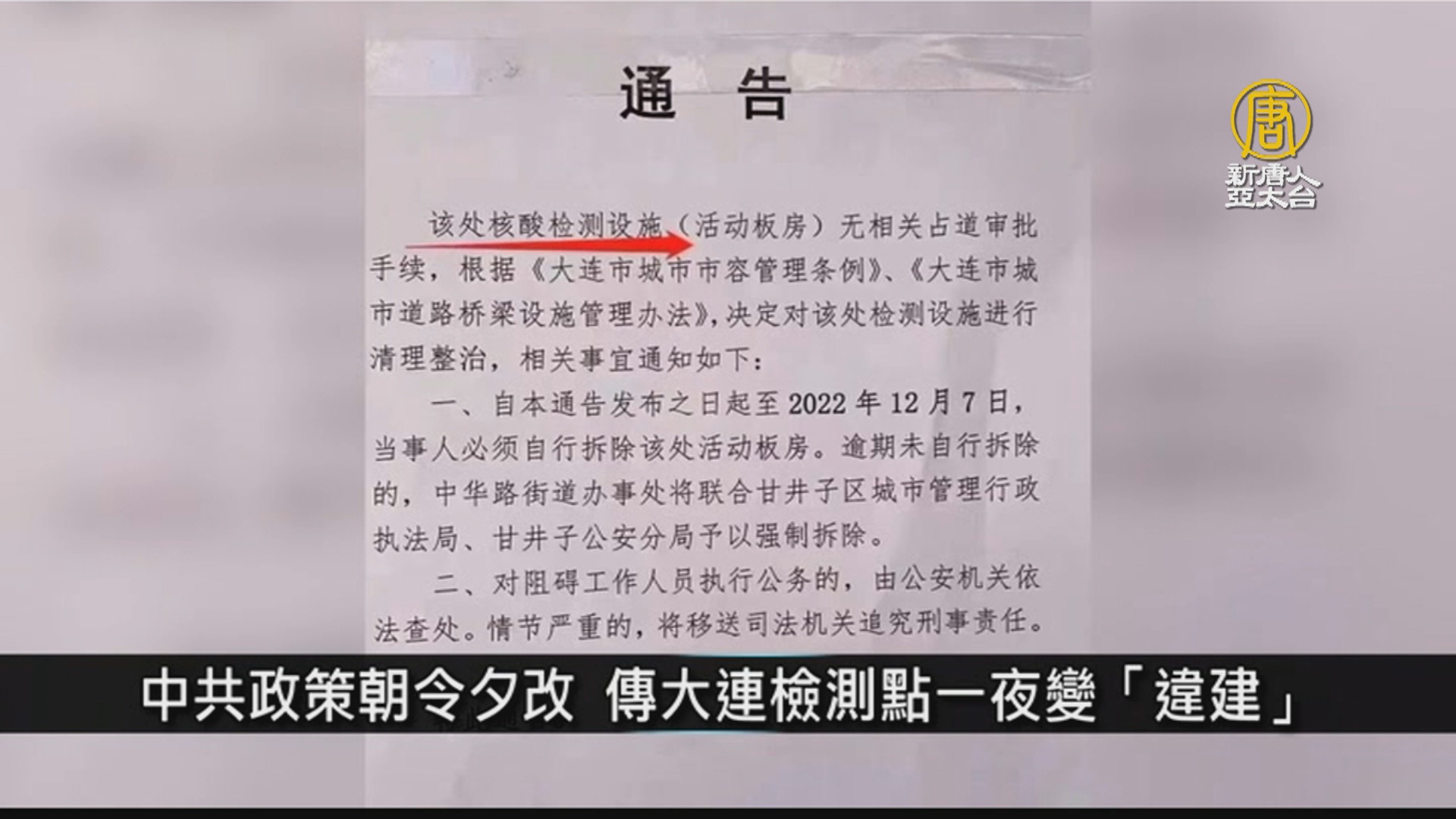 中共「防疫」朝令夕改,一片混亂,中共當局週三(7日)宣布所謂防疫「新十條」,但新十條中並未提到方艙醫院,有分析指出,各地方艙建設很可能迅速叫停,變成爛尾工程。另外,幾天前官方還在強逼民眾檢測核酸,而網傳通告顯示,大連市一處核酸檢測點現在已被定性為「違章建築」。