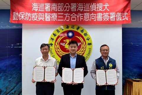 【新唐人亞太台 2022 年 12 月 08 日訊】為讓偵搜犬得到更好的照顧,海巡署南部分署今(8)日由分署長宋子陽與高雄市動物保護處處長葉坤松及社團法人高雄市獸醫師公會理事長馮宗宏共同簽署「三方合作意向書」,希望共同守護偵搜犬的照養、醫療及健康,維護查緝工作能量。