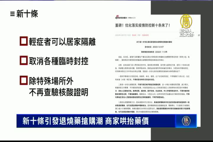 【新唐人亞太台 2022 年 12 月 09 日訊】中共當局推出「新十條」後,形同放棄動態清零。Omicron病毒在各地迅速蔓延開來,北京多家藥店的退燒藥脫銷,發熱門診部被擠爆。