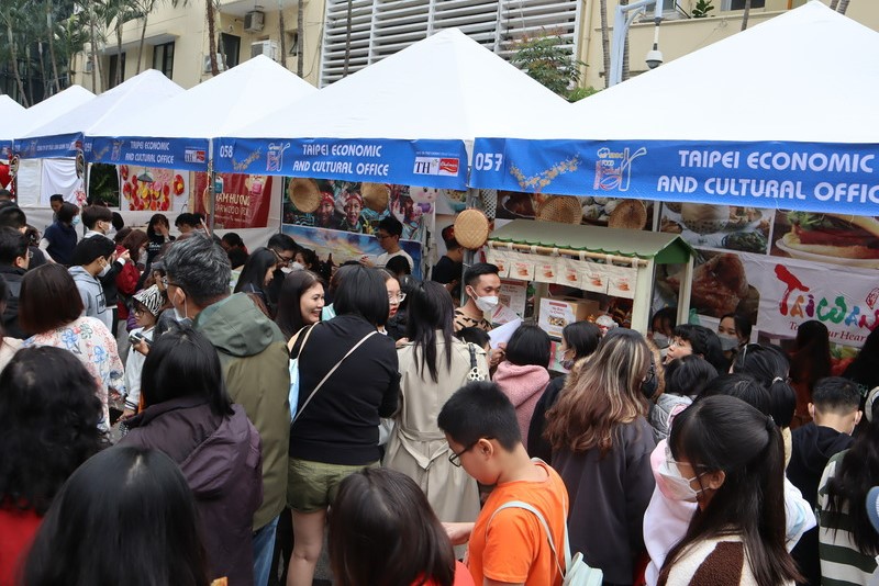 駐越南代表處攜手台商與業者一起參與2022越南國際美食節,台灣攤位前人潮不斷。駐越南代表石瑞琦表示,所得扣除成本後將全數捐給越南外交部做公益,以行動增進台越友誼。(圖/中央社)