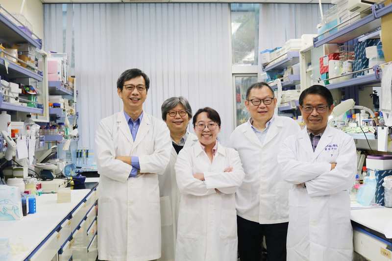 國立陽明交通大學一項最新研究發現,廣泛存在細胞膜或胞器表面的「口型蛋白」,在肥胖慢性病發展中扮演重要角色。圖為研究團隊董建億(圖左起)、花嘉玲、吳韶芩、林奇宏、楊智勇。 (圖/陽明交大提供)