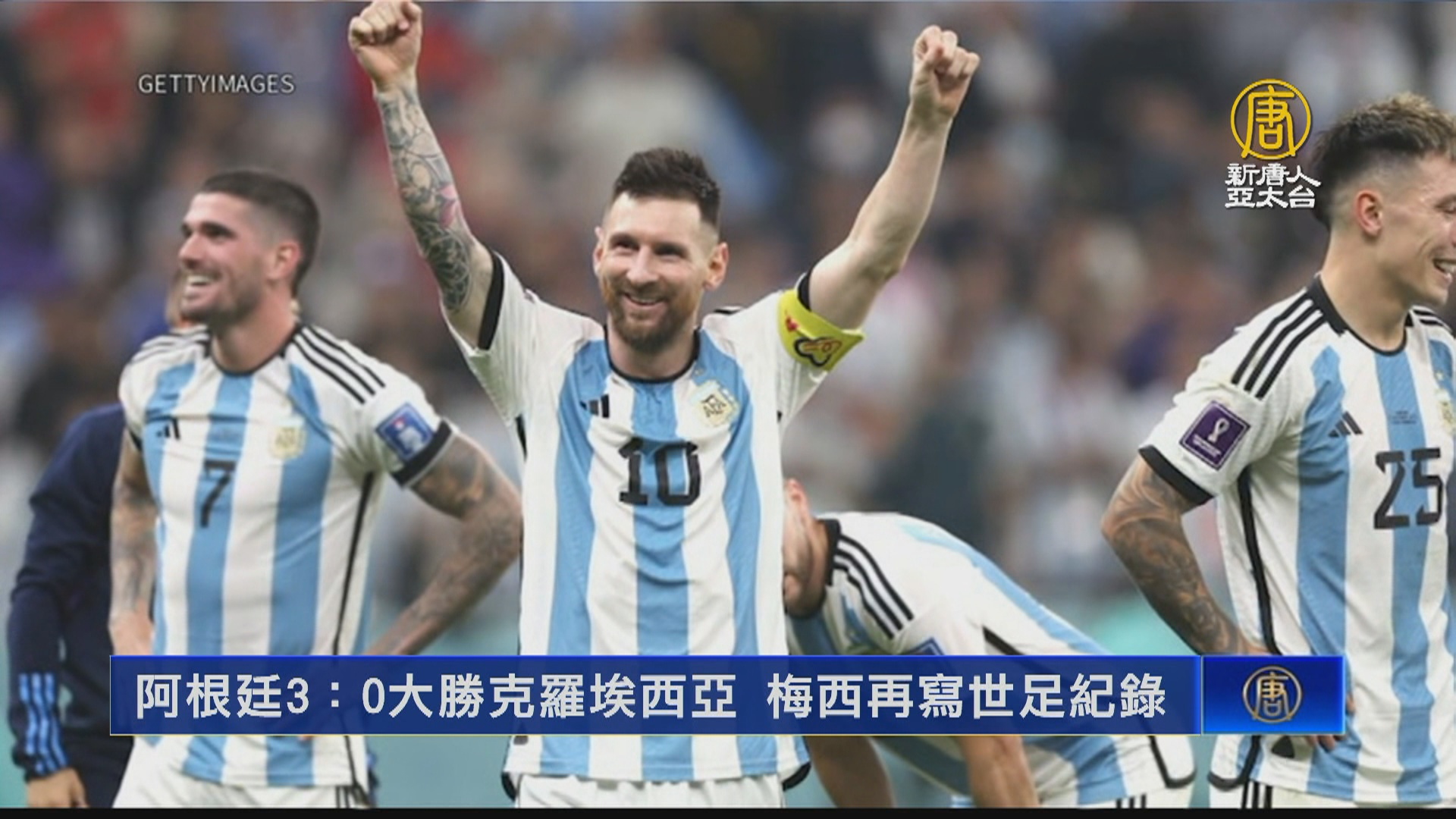 【新唐人亞太台 2022 年 12 月 14 日訊】迎回來,關心世界盃足球賽戰況,台北時間清晨,阿根廷對上克羅埃西亞,隊長梅西1進球1助攻,最後全隊以3:0大勝克羅埃西亞,挺進決賽。梅西在世界盃合計出賽25場,累計8助攻、11顆進球,梅西也再寫下個人在世足賽的紀錄。